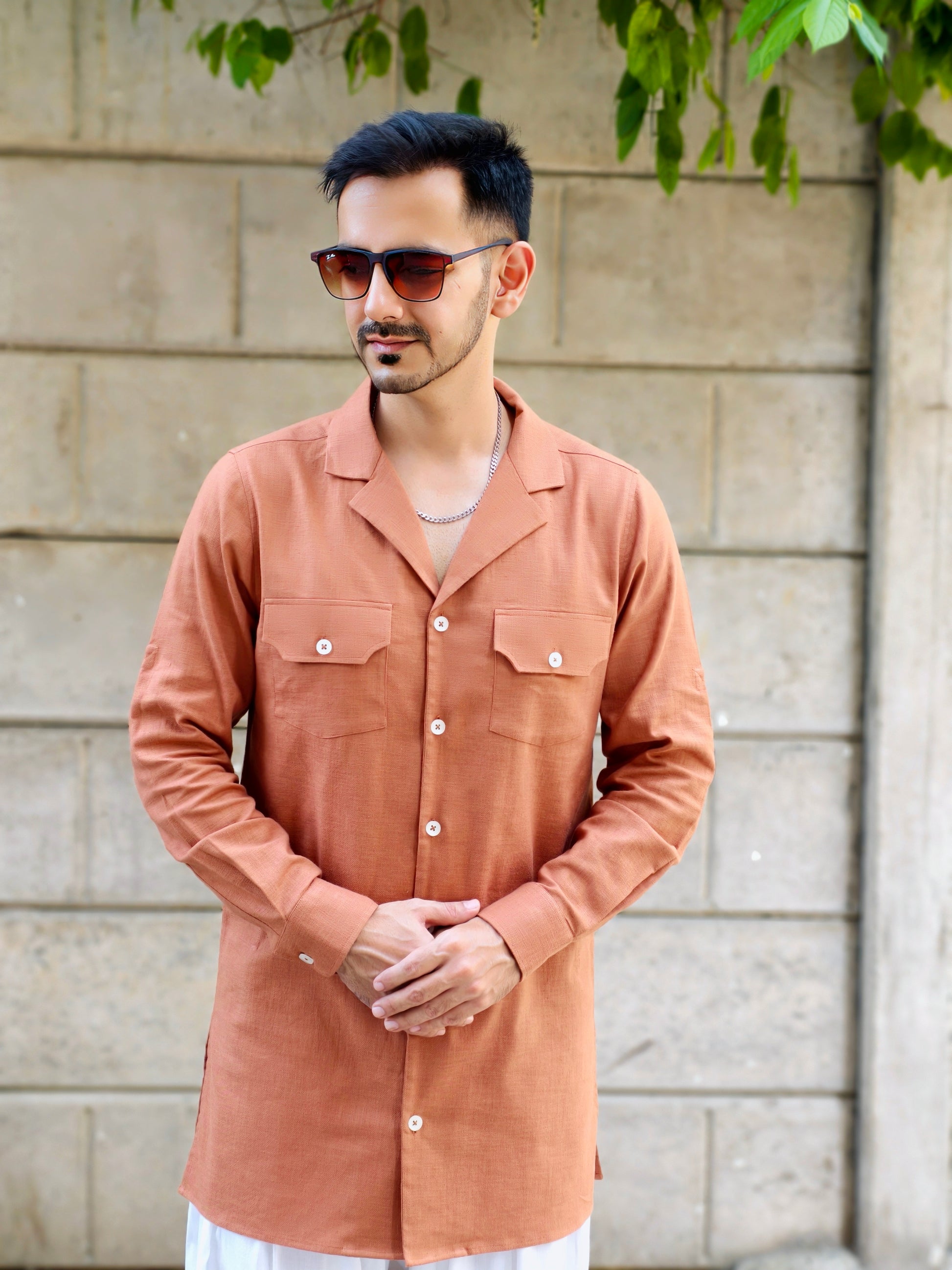 Refresh your ethnic wardrobe with this stylish men’s kurta dhoti set, designed for both comfort and sophistication. The set features a rust brown button-down kurta with a smart coat collar and dual chest pockets, paired with a classic white dhoti salwar for a relaxed yet polished look.
