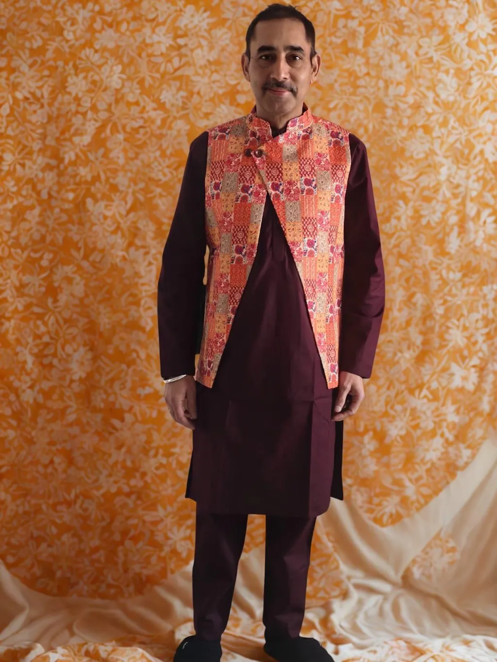 Add a vibrant touch to your ethnic wardrobe with this multicolor printed asymmetrical Nehru jacket for men. Designed with an elegant blend of traditional and modern designer style, this waistcoat instantly uplifts any plain kurta pajama or shirt. It features a rich mix of colors and intricate prints, making it a perfect choice for weddings, haldi functions, festive celebrations and parties. It has been provided with two adjacent closure buttons for tight and loose fit comfort as per choice.