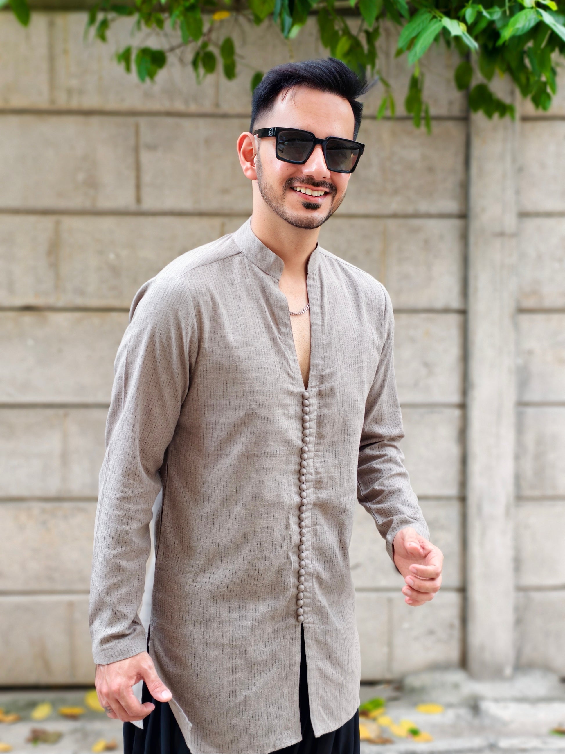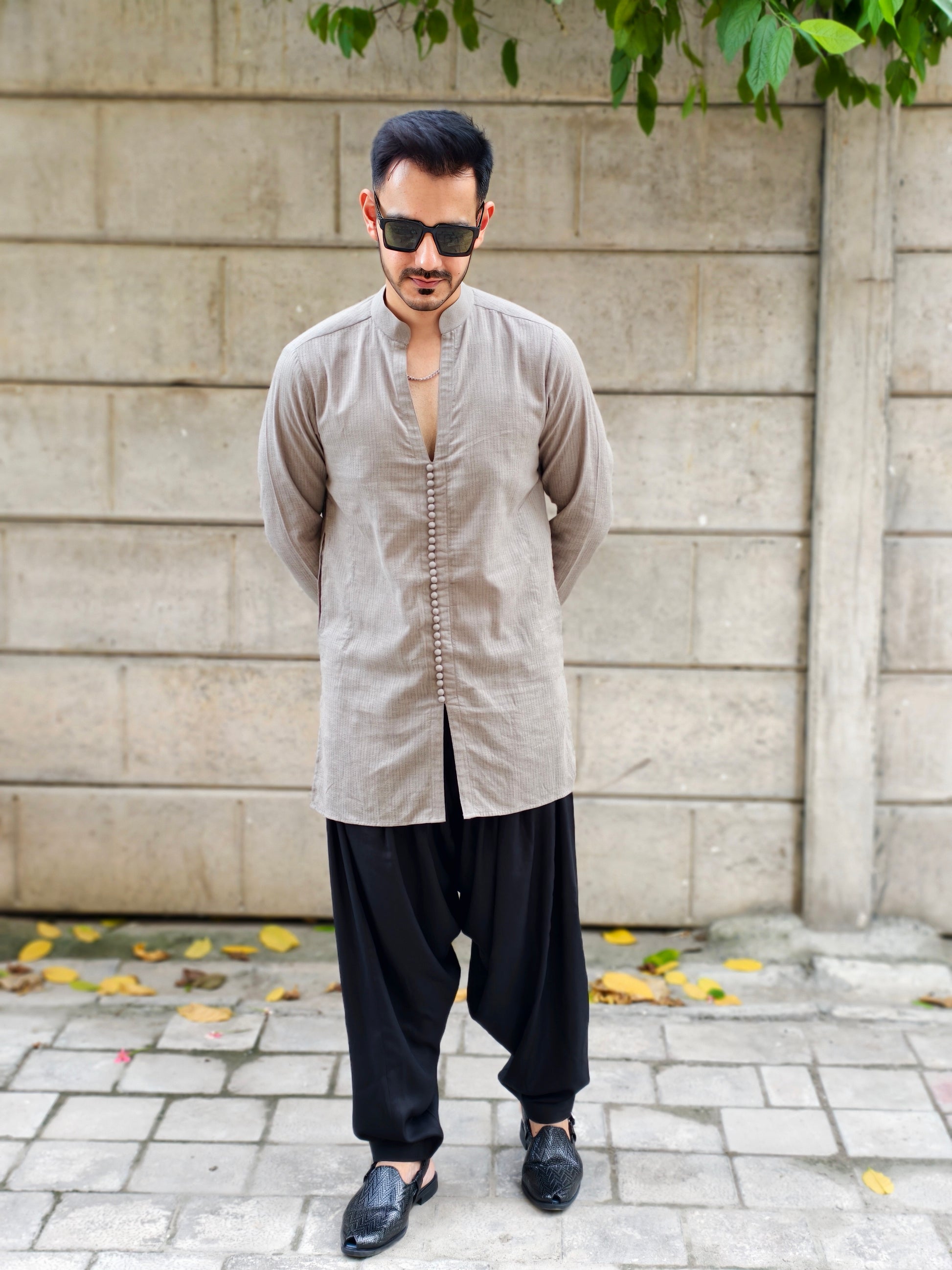 Upgrade your ethnic wardrobe with this stylish men’s taupe textured kurta paired with black dhoti pants. Designed for comfort and elegance, this set is crafted from breathable fabric with a sleek mandarin collar, fabric potli button detailing, and double side pockets, making it perfect for festive occasions, weddings, family gatherings, and cultural events. The contrast of a subtle taupe kurta with classic black dhoti salwar gives you a balanced look of tradition and modern charm.